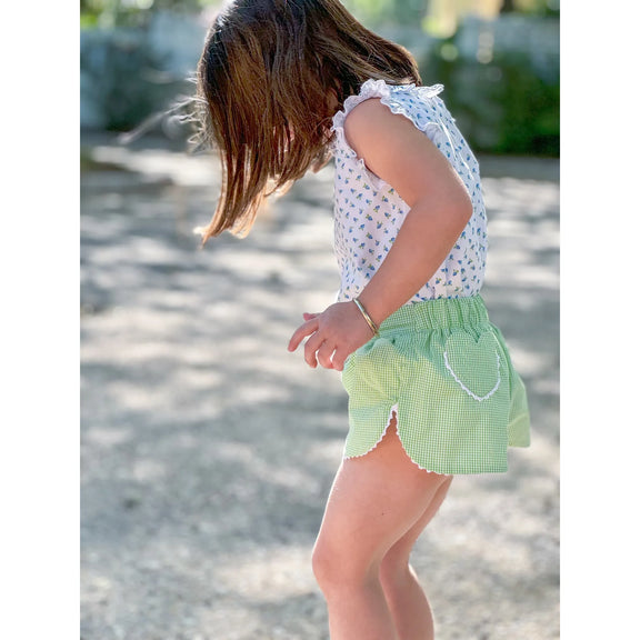 Classic AK in our custom Aquamarine print with hand smocking around the collar. Darling for that everyday AK look! Perfect to pair with our apple gingham Carolyn, or Anna Belle Shorts, or our white eyelet bottoms!