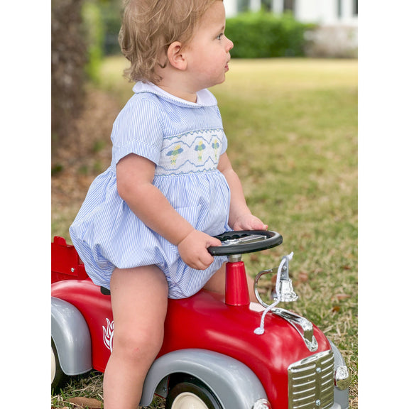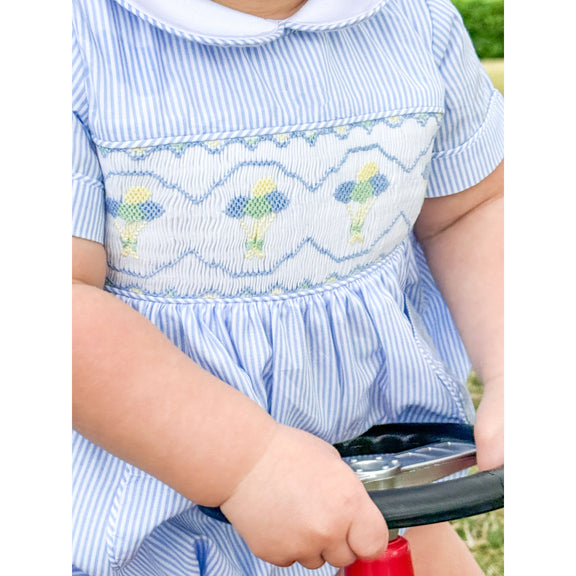 In collaboration with Mollie Jane Taylor's "Balloons" smocking plate, bubble designed by Kathryn Thomas, founder and designer of Alice Kathleen, with each piece having much attention to detail. This is the quintessential bubble for your AK boy to celebrate his special day! Our darling blue and white stripe bubble with hand- smocked balloons in the most AK color combinations. Belted in the back for that so Alice Kathleen look.