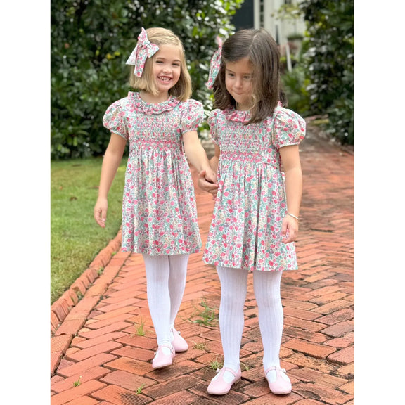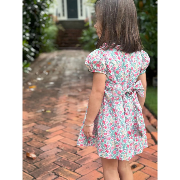 The most darling short sleeve puffed dress with smocking at the waist, delicate feather stitching along the ruffled collars edge. Fully lined and a darling sash give this piece the AK look. A darling year round dress, pairs perfectly with all of our pink shoes and sweaters. For an extra special look, add our Kit Cape!