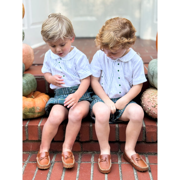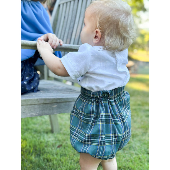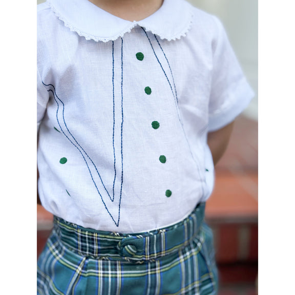 Our Henry Bubble is ready for Thanksgiving in the most charming Spanish plaid — rich in color and perfect for the season. It’s paired with a linen shirt, hand-embroidered in the perfect shades of blue and green for that unmistakable AK look.