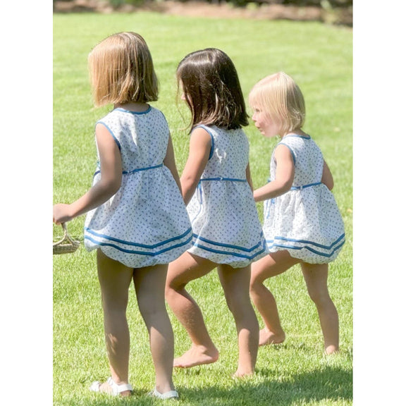 Introducing the sweetest romper from Alice Kathleen & Co., made in our custom fabric featuring all shades of blue strawberries on 100% cotton. With a flattering drop waist and a charming belt that ties into a bow, this piece is the perfect blend of comfort and style. Classic AK, this romper isn’t just for babies—it's perfect for all ages, offering timeless charm and a playful twist to any wardrobe.