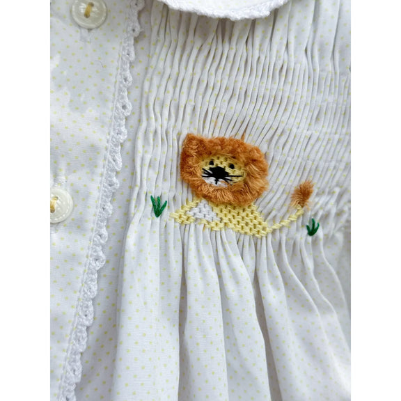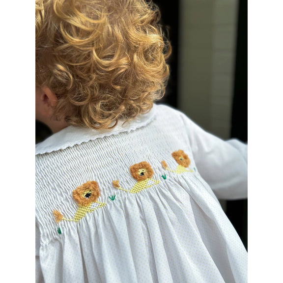 Introducing The Darling Hand-Smocked Set, a charming and timeless piece in Alice Kathleen’s custom Butter Bitty Dot fabric. This beautifully crafted set features delicate hand-smocking, with butter corduroy trimmings that add a subtle, luxurious texture. The coordinating Ford bloomer pants bring a classic, so AK look. AK’s signature white picot trim around the collar and front completes the look, offering a refined and elegant detail. Perfect for any special occasion, this set combines traditional craftsmanship with modern elegance.