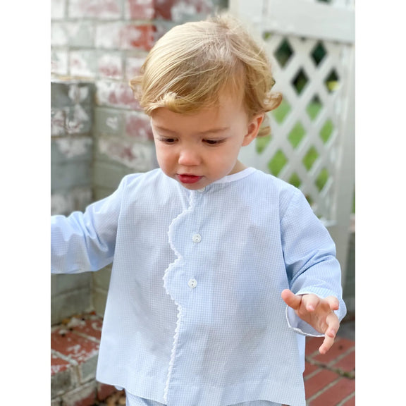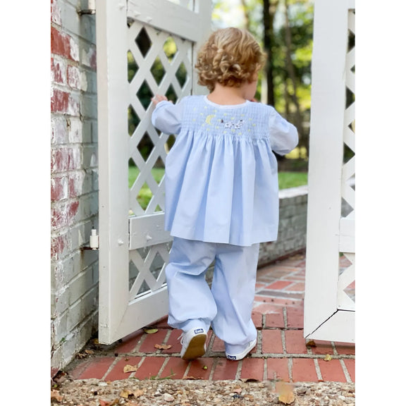 Introducing the darling cow jumps over the moon smocked set, proved to be a favorite for our AK boys! The set showcases the darling nursery rhyme and is hand-smocked , beautifully crafted and adorned on a backdrop of light blue bitty dot 100% cotton.