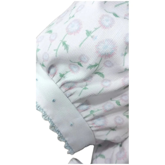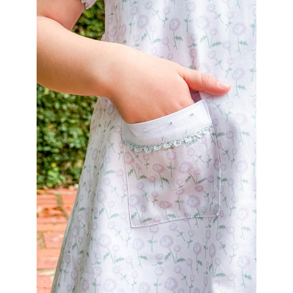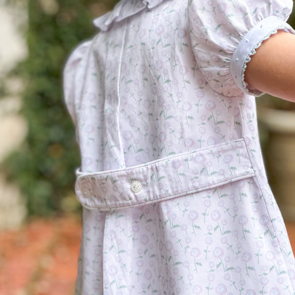 Introducing our charming Penelope dress, a true masterpiece of craftsmanship and whimsy. This original AK apron dress is crafted from our custom Swiss pique fabric with pink and blue dandelions.