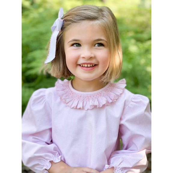 Introducing our Hand-Smocked Ruffle Blouse—a versatile staple from our vintage, fall, and Christmas collection. Crafted in AK custom pink gingham, this blouse features delicate hand smocking in a beautiful shade of light pink. With scalloped edging and buttons down the back, it exudes timeless charm and elegance. Pair it with skirts, or layer it under sweaters or overalls for a stylish look. This blouse is a must-have piece that will create cherished memories during festive seasons.