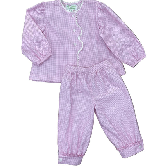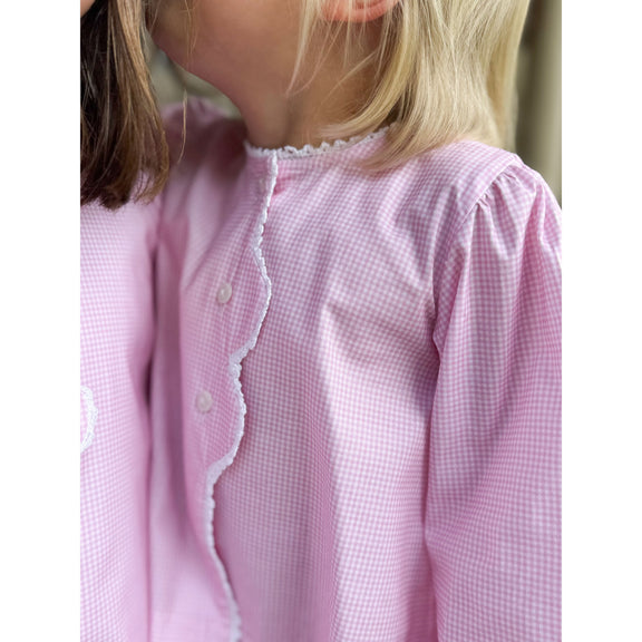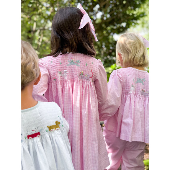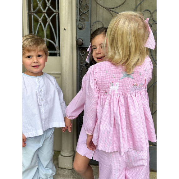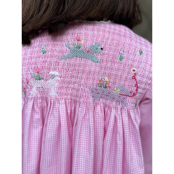 Let the puppy party begin! This darling set is made from our custom 100% cotton candy pink gingham and features hand-smocked pastel puppies across the bodice — stitched in all the perfect AK colors, of course.