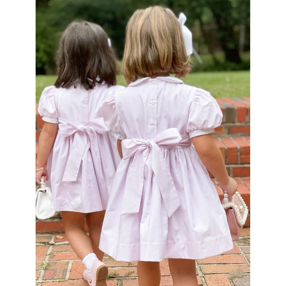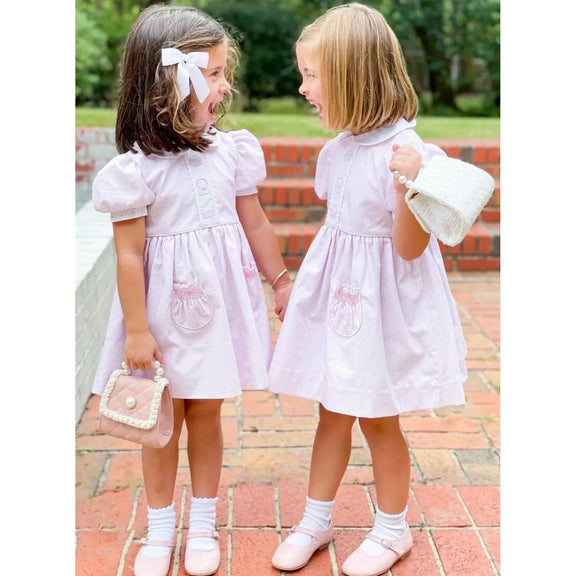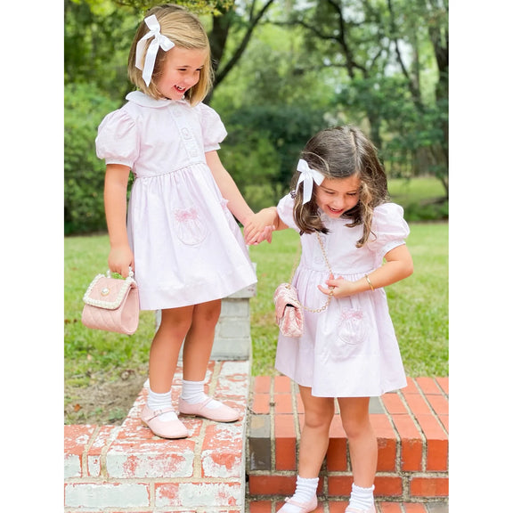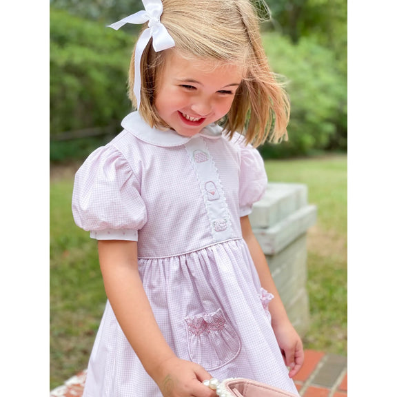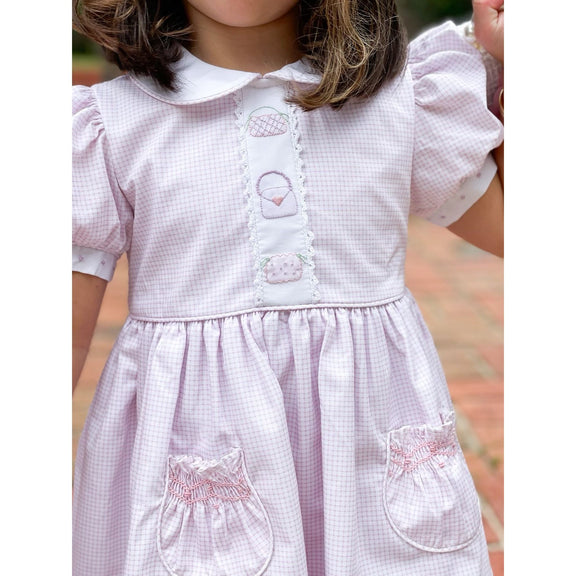 Darling year round pink and white windowpane girls dress with smocked pockets and 3 darling shadow work purses. A sash in the back for that so Alice Kathleen look.