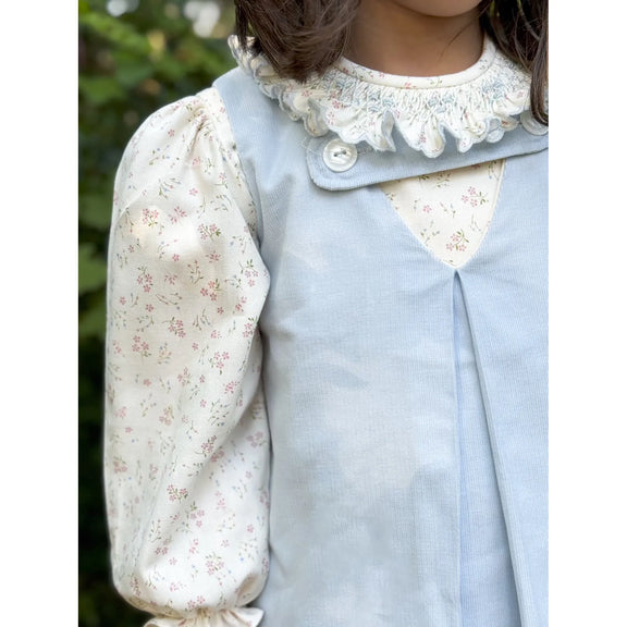 Hand smocked brushed floral twill blouse. This is a darling staple for her Fall/Winter Wardrobe. Darling under Jumpers, or pair with our many bloomer pants available in our Fall Collections! For that SO AlK look pair with our blue corduroy Eleanor and a pink cardigan.