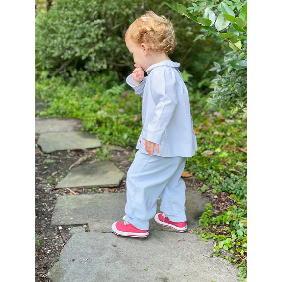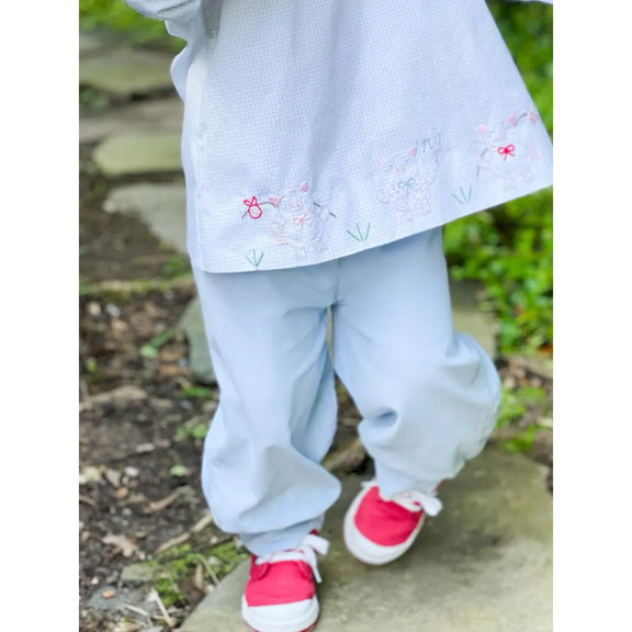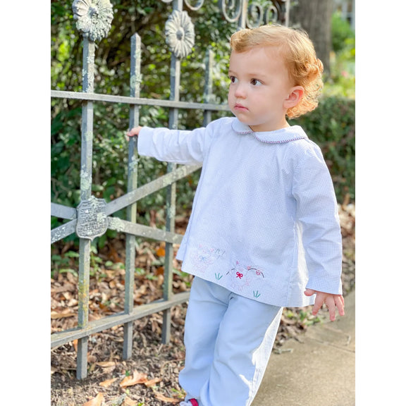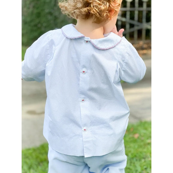 Introducing our exquisite Shadow Work and Embroidery Three Little Pigs Top, specially designed for boys with a touch of charm and uniqueness. This top features meticulous shadow work and embroidery, showcasing the beloved tale of the Three Little Pigs. Crafted in a delightful blue and white windowpane pattern, the top exudes a classic and timeless appeal.