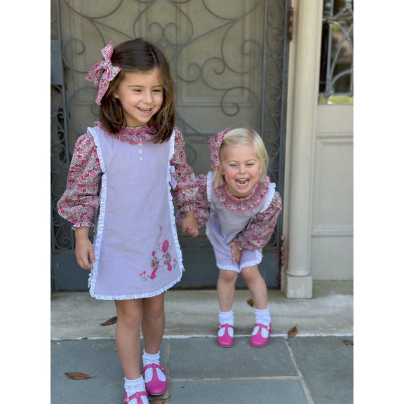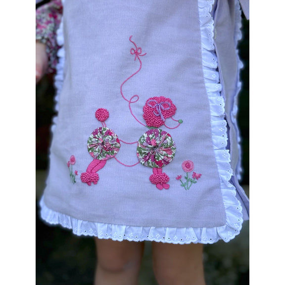 Darling hand embroidered poodle with a combination of Liberty of London purple and hot pink flowers, hand stitched for that So AK look. Gathered Swiss eyelet around this darling shift dress. Mother of pearl flower buttons for the sweetest detail. Darling with our smoked ruffle blouse in Liberty of London.